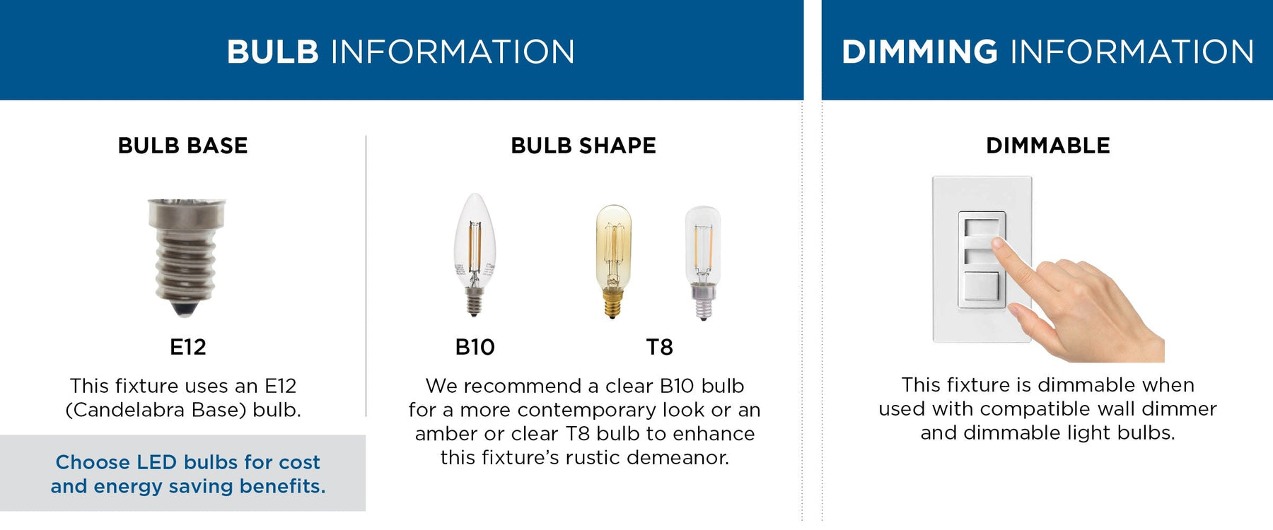 A: The chandelier uses six candelabra base bulbs (E-12) with a maximum wattage of 60W each, compatible with LED, CFL, and incandescent options.