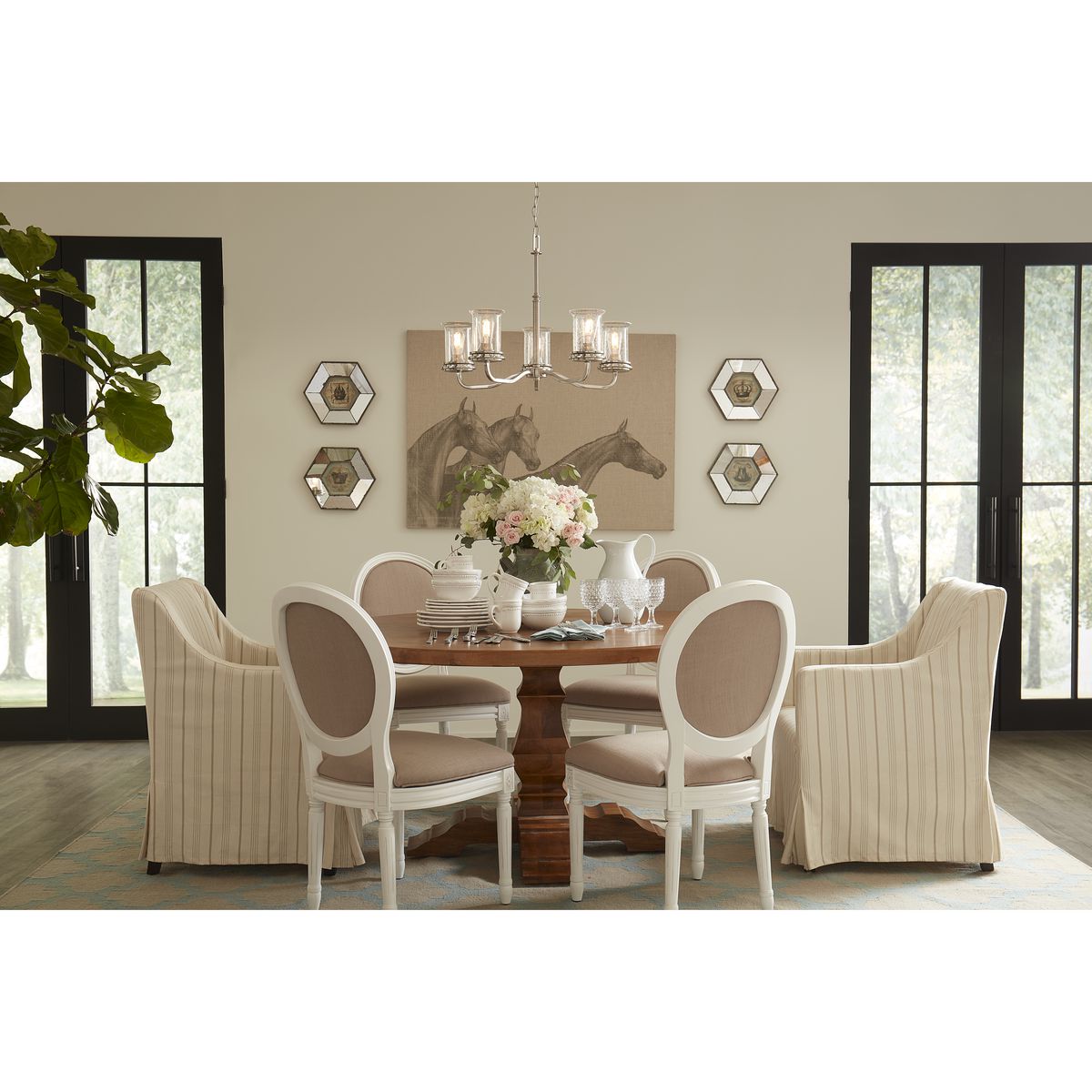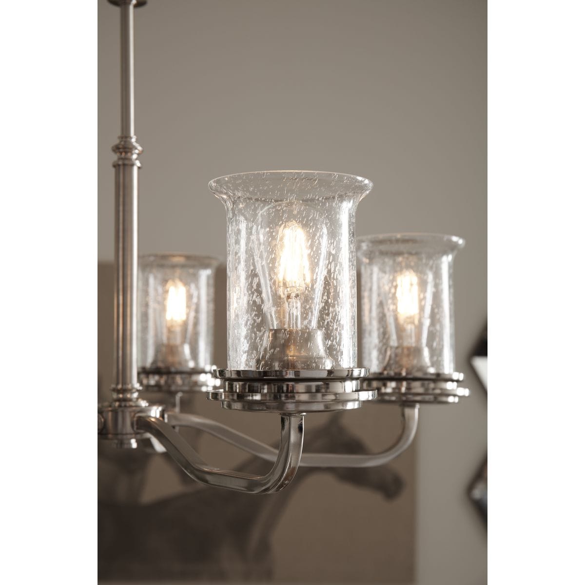This Winslett 5-Light Chandelier transforms any space into a coastal haven, radiating elegance with its brushed nickel finish and delicately seeded glass shades. Its stately presence, reminiscent of ocean breezes and warm sands, creates a soothing ambiance perfect for intimate gatherings or thoughtful solitude. Pair it with natural textures and a muted color palette to enhance the soft glow. With its artful design, this chandelier is not only a source of light but a centerpiece of luxurious seaside living.