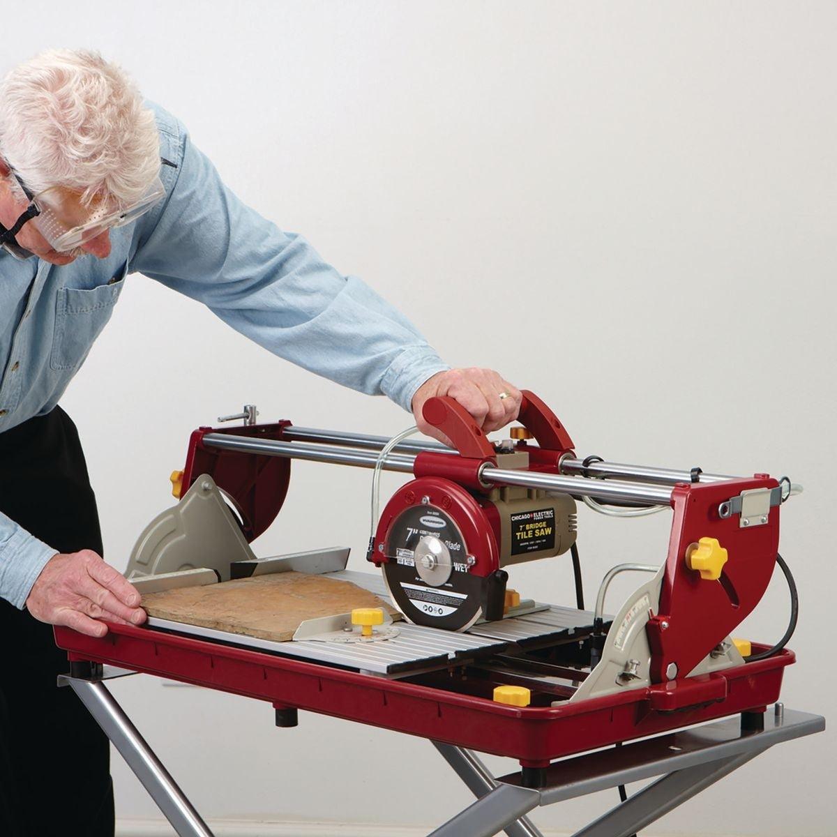 The 1.5 HP 7 in. bridge tile saw is designed for cutting ceramic tile, quarry tile, marble, terra-cotta and slate up to a maximum thickness of 1-1/8 in. when cutting at a 90 degree angle. The design also accommodates cut-lengths up to 20 in. long. This versatile tile saw includes miter gauge and splash guard.