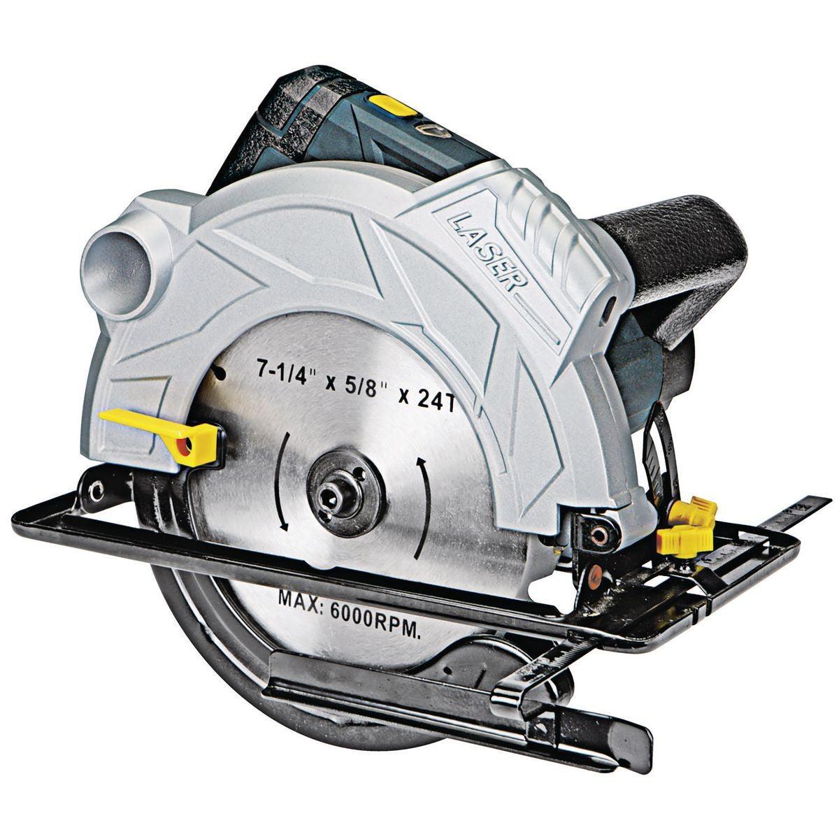 This 12 Amp Professional Circular Saw has a built-in laser guide for straight, accurate cuts. The lightweight rugged aluminum housing is easily to handle with all-day use. Adjustable footplate allows precise bevel cuts. Features include a dust chute and protected trigger with safety lock.