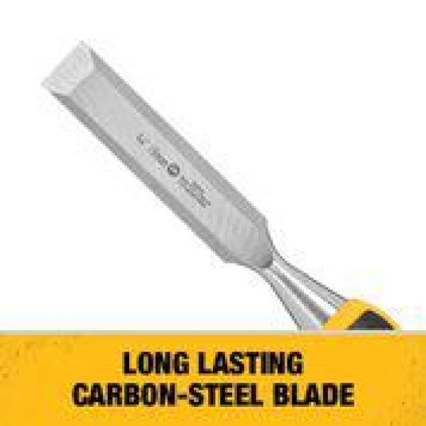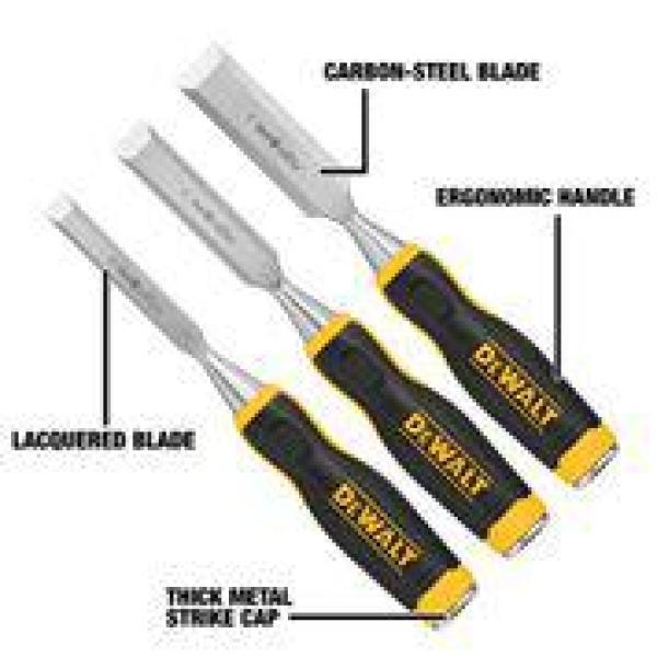 Included in this set, you'll find in., 3-1/4 in. and 1 in. wood chisels. These wood chisels are designed with the professional in mind. The handle is ergonomically constructed for comfort, with a durable metal cap for striking and driving the chisel blade. The carbon steel blade is tempered and hardened to ensure a long-lasting edge, and lacquered to protect against corrosion.