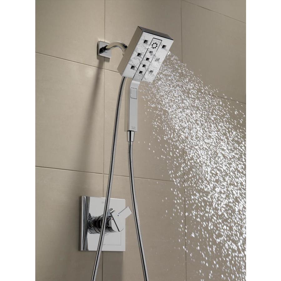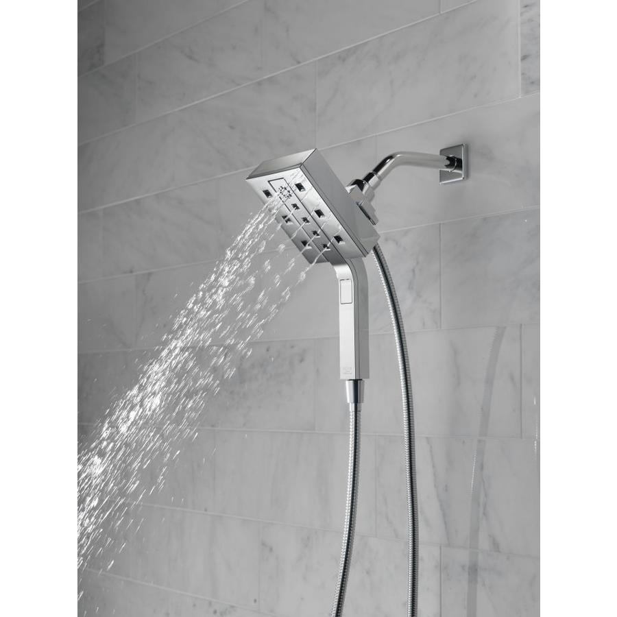 This Delta In2ition H2Okinetic two-in-one combines a fixed shower head with a detachable hand shower for flexible coverage. Delivering up to 2.0 GPM, it features H2Okinetic technology for a drenching, water-saving spray and a secure MagnaTite dock in a sleek chrome finish.