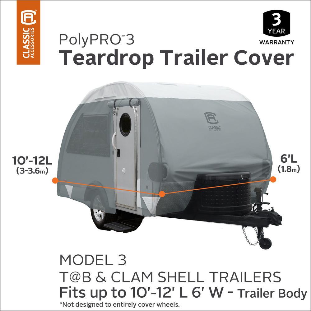 • Teardrop trailer cover: fits 10 ft. - 12 ft. L, 6 ft. wide tab and clam shell teardrop trailers
