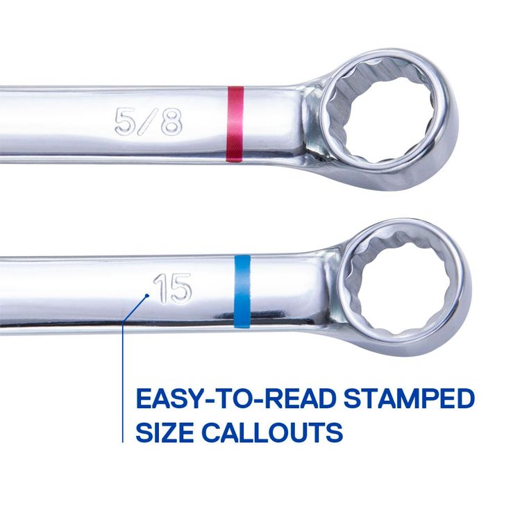 12-point design allows work on multiple fasteners including 6-point, 12-point, star, square and most rounded 12-point design also provides flexibility and versatility in wrench positioning 15 ° offset provides clearance for hands during use Constructed of chrome vanadium steel and heat treated for strength and durability Professional grade, high polish finish Size callout is hard stamped Meets or exceeds ASME specifications Hassle-free lifetime guarantee