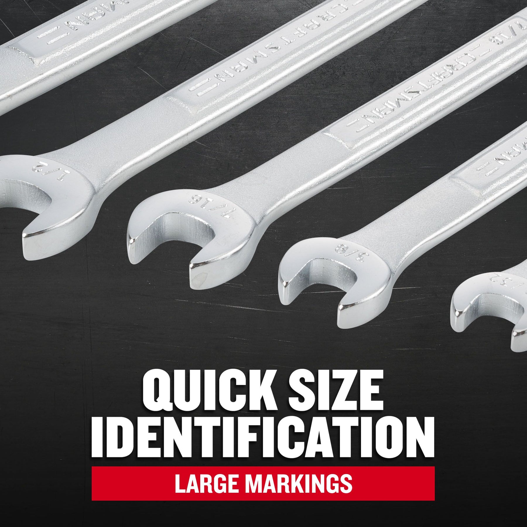 Durable Craftsman combination wrenches in a 7-piece SAE set with a full-polish chrome finish for corrosion resistance. 12-point box ends with a 15° offset deliver quick engagement and added knuckle clearance; stored in a soft pouch for easy transport.