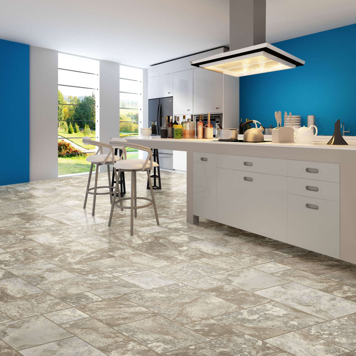 Durable, low-gloss sheet vinyl featuring Congoleum’s Stain Defense urethane wear layer and UltraTec backing for easier installations. The Terrace design in Cashmere delivers a realistic stone look that’s cut-to-length to fit kitchens, baths, and living spaces.