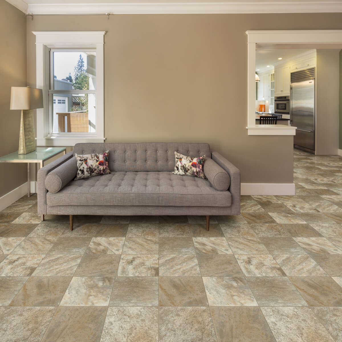 Durable Congoleum ArmorCore sheet vinyl delivers a realistic stone look in the Valley Path design, Quicksand color, with a low-gloss urethane wearlayer for everyday resilience. Cut-to-length 12-foot wide rolls install loose-lay, perimeter, or full spread to suit residential spaces.