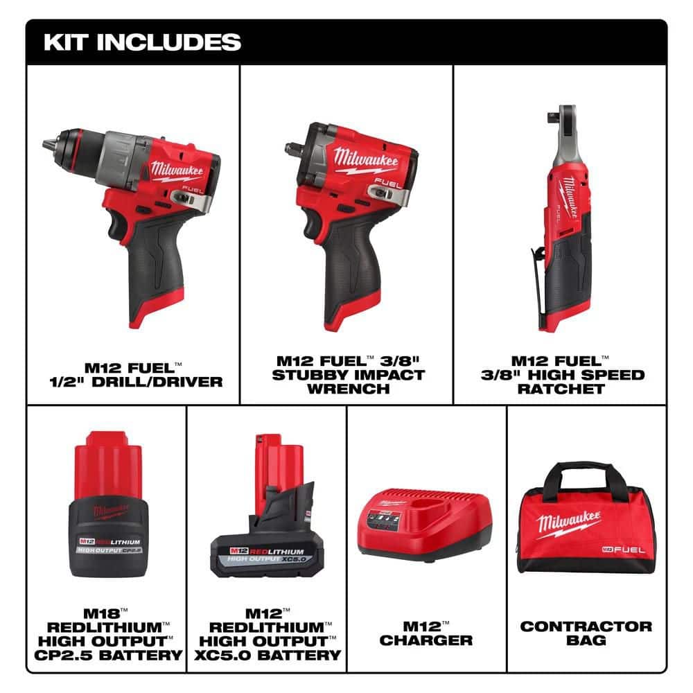 This M12 FUEL combo packs a 1/2 in. drill/driver, 3/8 in. stubby impact wrench, and 3/8 in. high-speed ratchet powered by brushless motors and REDLITHIUM batteries. Built for compact power, it delivers up to 550 ft-lbs nut-busting torque, fast 450 RPM ratcheting, and durable all‑metal construction—complete with two batteries, charger, and contractor bag.