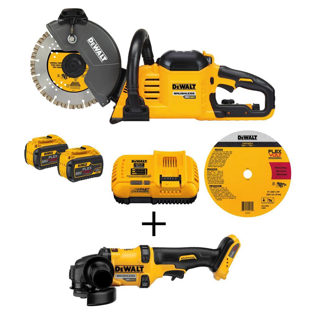 DEWALT FLEXVOLT 60V Lithium‑Ion Cordless 9 in. Cut-Off/Construction Saw with (2) FLEXVOLT Batteries, Bonus 4-1/2 in. Angle Grinder
