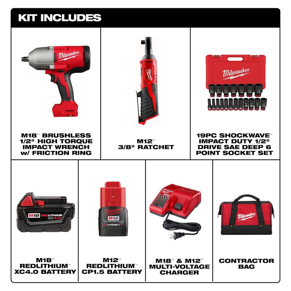 A: M18 Brushless 1/2 in. High Torque Impact Wrench w/ Friction Ring (2666-20), M12 3/8 in. Ratchet (2457-20), M18 REDLITHIUM XC4.0 Battery, M12 REDLITHIUM CP1.5 Battery, M18/M12 Multi-Voltage Charger, 19-piece Shockwave 1/2 in. drive SAE deep 6‑point socket set, contractor bag.