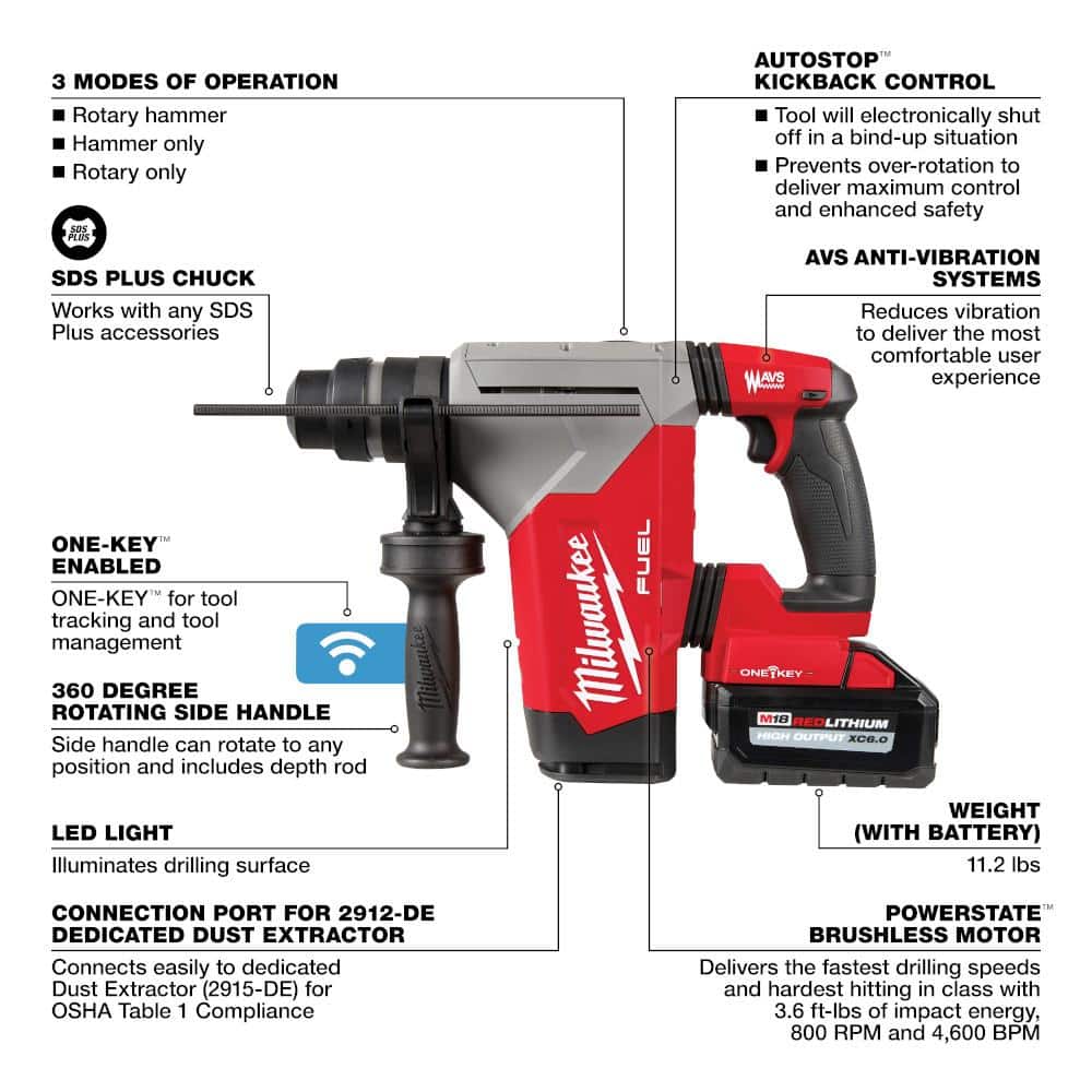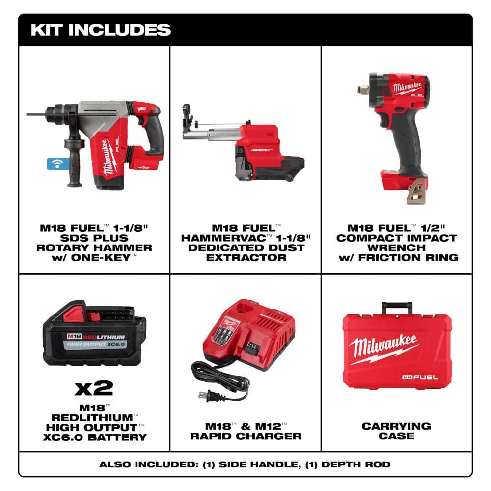 Milwaukee M18 FUEL 18V Lithium-Ion Brushless 1-1/8 in. Cordless SDS-Plus Rotary Hammer Kit with Dust Extractor, 2 XC6.0 Batteries, Rapid Charger & M18 FUEL Impact Wrench