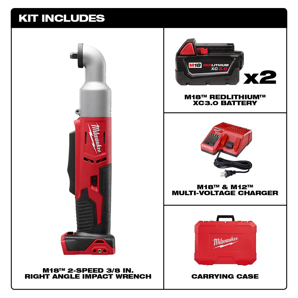 • Includes: (1) 2668-20 M18 3/8 in. right angle impact wrench, (2) 48-11-1828 M18 REDLITHIUM XC 3.0 Ah batteries, (1) 48-59-1812 M12/M18 multi-voltage charger, (1) carrying case