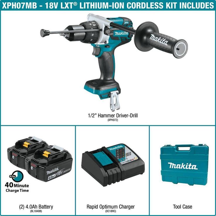 • Includes: 18-Volt LXT BL 1/2 in. hammer driver-drill (XPH07Z), (2) 18-Volt LXT lithium-ion 4.0Ah battery (BL1840B), 18-Volt lithium-ion rapid optimum charger (DC18RC), tool belt clip (346317-0), depth gauge (122576-8), XPH07 side handle (126413-8), tool case