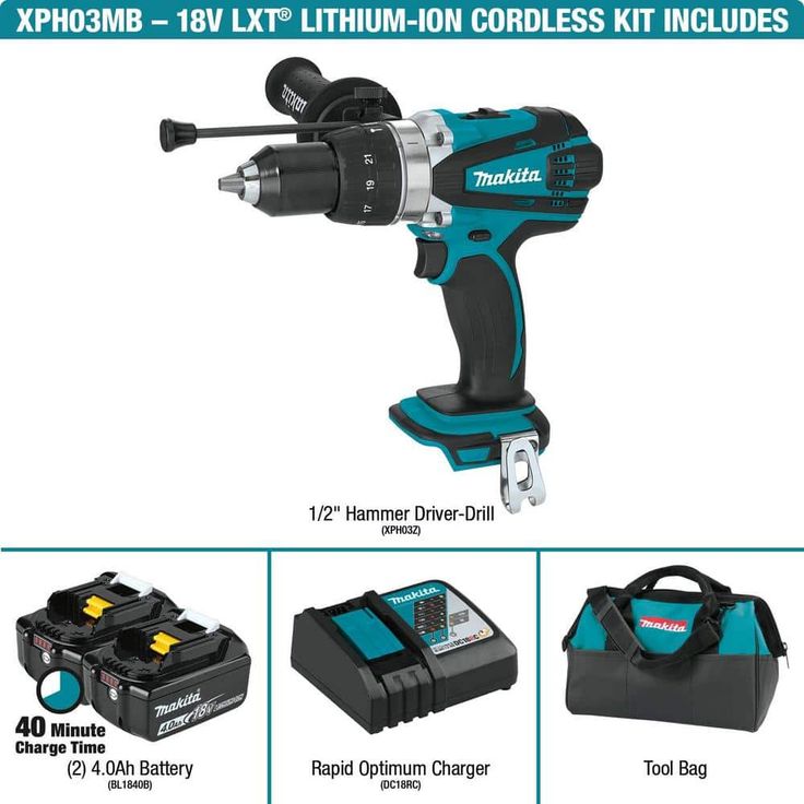 The 18-Volt LXT Lithium-Ion 1/2 in. Hammer Driver-Drill (model XPH03MB) delivers a full 750 in. lbs. of MAX Torque, with more work and less down time for increased efficiency and productivity. It's powered by the Makita 18-Volt LXT Lithium-Ion 4.0Ah battery, which reaches a full charge in only 40 minutes and delivers 35% more run time than the 3.0Ah battery (BL1830). For added convenience, the battery features an integrated LED battery charge level indicator. For increased durability, Extreme Protection Technology (XPT) is engineered inside the tool for increased resistance to water and dust and improved operation in harsh jobsite conditions. It's part of Makita's expanding 18-Volt Lithium-Ion series, the world's largest cordless tool line-up powered by an 18-Volt lithium-ion slide-style battery. Makita 18-Volt Lithium-Ion batteries have the fastest charge times in their categories, so they spend more time working and less time sitting on the charger. For improved tool performance and extended battery life, Makita created Star Protection Computer Controls. Star Protection is communication technology that allows the Star Protection-equipped tool and battery to exchange data in real time and monitor conditions during use to protect against overloading, over-discharging and overheating. For increased versatility, the tool can also be powered by Makita 18-Volt LXT and Compact Lithium-Ion batteries with the star symbol on the battery indicating Star Protection inside.