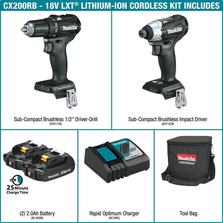 • Includes: 18V LXT Sub-Compact 1/2 in. Driver-Drill (XFD11ZB); 18V LXT Sub-Compact Impact Driver (XDT15ZB); 18V LXT Rapid Optimum Battery Charger (DC18RC); 18V LXT Lithium-Ion 2.0Ah Battery (BL1820B)