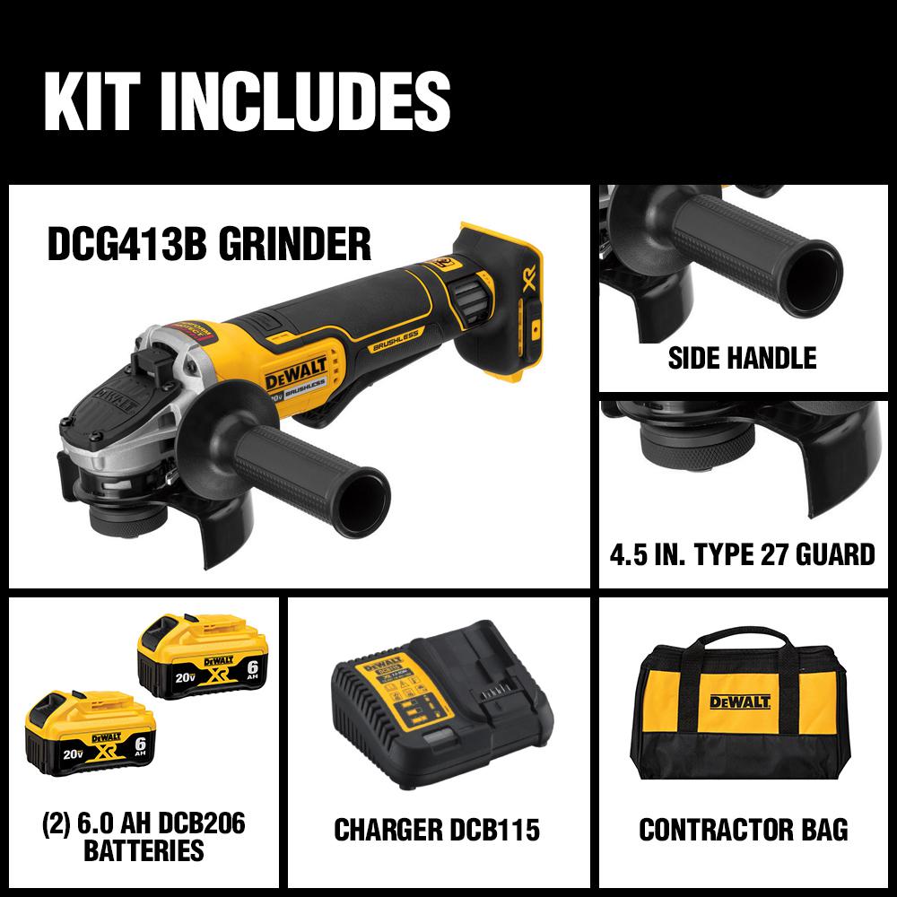 The 20V MAX XR (R) Angle Grinder features a brake, E-Clutch (R) System, and Kickback Brake. The brake quickly brings the wheel to a stop in two seconds or less when the trigger is released. The E-Clutch (R) System automatically shuts down the motor when a wheel pinch in detected. These two features working together to shut the tool down without user interaction, called the Kickback Brake. Additionally, the grinder features a One-Touch (TM) Guard, which allows for single-action adjustments to change guard position.