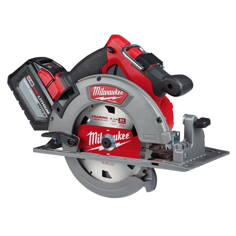 The Milwaukee M18 FUEL brushless cordless circular saw was designed for carpenters, remodelers and general contractors that rely on durable and dependable tools. This rechargeable battery powered circular saw delivers the same power and cuts faster than a 15Amp corded saw, delivers up to 750 cuts per charge. The POWERSTATE Brushless Motor was purposely built for the M18 FUEL 7-1/4 in. Circular Saw to provide the power and performance of a 15Amp corded circular saw. Built-in REDLINK PLUS Intelligence ensures optimal tool performance and provides overload protection to prevent damage to the tool and battery during heavy applications while still maintaining compatibility across the entire M18 System. The REDLITHIUM High Output HD12.0 Battery Pack provides 50% more power and runs 50% cooler versus standard REDLITHIUM HD packs. Its superior pack construction provides the industry's best protection against jobsite conditions. In addition to the circular saw, this kit comes with one M18 REDLITHIUM High Output HD12.0 battery pack (48-11-1812), one M18/M12 multi-voltage rapid charger (48-59-1808), a durable contractor bag, one ready-to-use circular saw blade, and one blade wrench