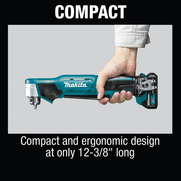The Makita 12-Volt maximum CXT Lithium-Ion Brushless Cordless 3/8 in. Right Angle Driver-Drill delivers power and speed in an ultra-compact size for efficient drilling, driving and fastening in tight spaces. The AD03 has a 3/8 keyed metal chuck for improved bit gripping power and a compact angle head height of only 2-1/2 for work in close quarters. With Makita 12-Volt maximum CXT Lithium-Ion slide-style batteries, users get superior balance and ergonomics over pod-style batteries. For added convenience, the batteries include an on-board LED charge level indicator. The AD03 weighs only 2.6 lbs. (with 2.0Ah battery), with variable speed (0-1,100 RPM) and up to 245 in./lbs. of Max Torque. Convenience features include an easy-to-operate paddle switch with variable speed control and built-in LED light to illuminate the work surface. It's an ideal solution for users seeking a more compact driver-drill with less weight and for applications in tight spaces. For longer run time, 12-Volt maximum CXT cordless tools are also compatible with the 12-Volt maximum CXT Lithium-Ion 4.0Ah battery (BL1041B, sold separately). 12-Volt maximum CXT Lithium-Ion batteries are engineered with a Battery Protection Circuit that protects against overloading, over-discharging and over-heating. Its part of the expanding 12-Volt maximum CXT series, combining performance with superior ergonomics in a compact size.