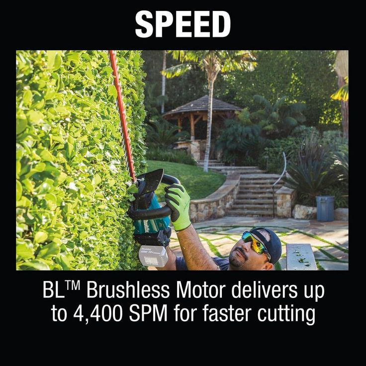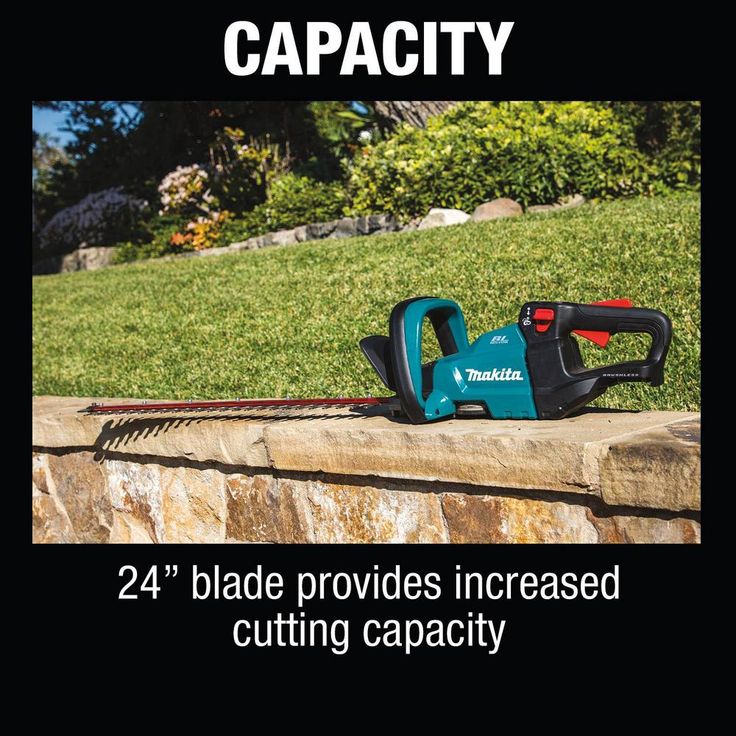 The Makita 18-Volt LXT Brushless Cordless 24 in. Hedge Trimmer (model XHU07Z, tool only) is part of Makita's wide range of cordless outdoor power equipment. The XHU07Z Hedge Trimmer has a 24 in. blade for increased cutting capacity and a 5-position rotating handle for increased comfort when trimming vertically or at an angle. A Makita-built brushless motor delivers 4,400 SPM for faster cutting speed when set on the high speed option. The cordless XHU07Z has zero emissions and reduced maintenance: there's no engine oil to change, no spark plug to replace, and no air filter or muffler to clean. And there's no need to drain the fuel for storage. Simply pickup your XHU07Z, load an 18-Volt LXT Lithium-Ion battery (sold separately), and the trimmer is ready to use. The XHU07Z part of Makita's expanding 18-Volt Lithium-Ion system, the worlds largest cordless tool line-up powered by an 18-Volt Lithium-Ion slide-style battery. Makita 18-Volt Lithium-Ion batteries have the fastest charge times in their categories, so they spend more time working and less time sitting on the charger.