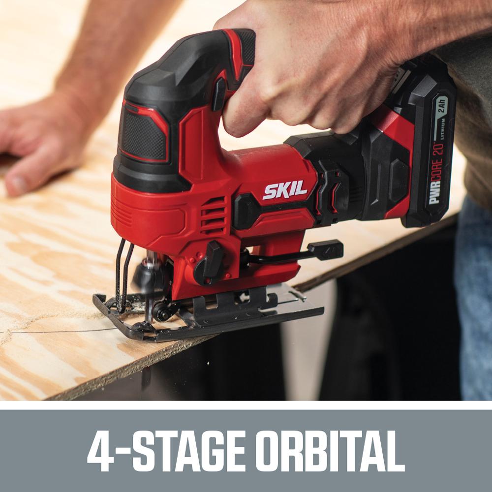 A Wood Saw With Focus On Precision. Customize each cut with the Skil 20-Volt Cordless Jigsaw. This safe and easy-to-use cordless jigsaw is perfect for first-time DIYers and experienced users alike. Its ideal for straight and intricate cuts in softwoods, particleboard and plywood. This power saw comes with a PWRCore 20-Volt 2.0 Ah Lithium Battery and 20-Volt Charger.