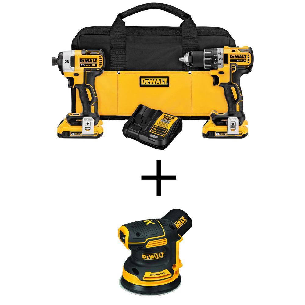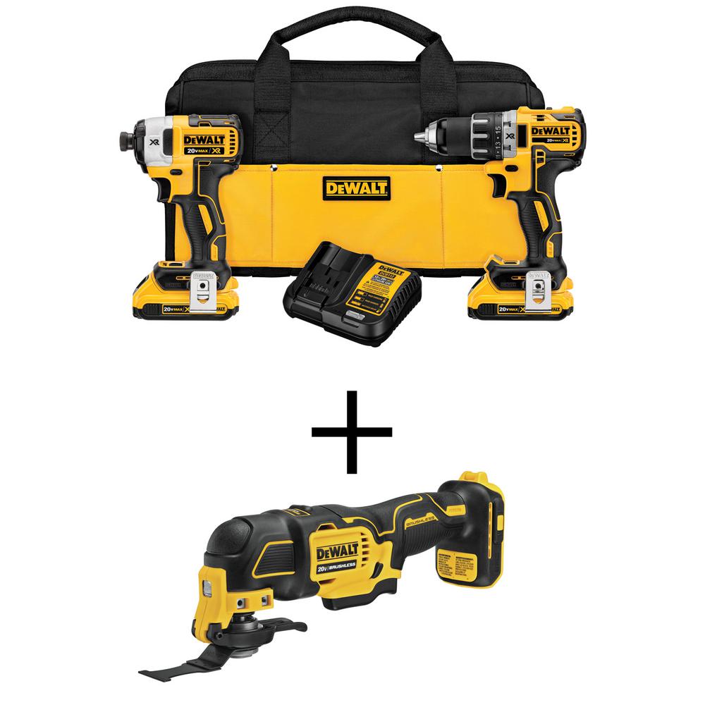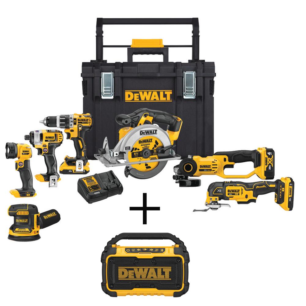 This 20V MAX* Cordless Compact 7-Tool Combo Kit includes one 4 Ah battery and two compact 2 Ah batteries. It's a versatile kit, featuring our a brushless hammer drill which is lightweight and compact for big jobs in tight spaces. The impact driver has a 2-speed transmission with up to 1500 RPMs for a range of fastening and drilling applications. Cut 2x4 lumber at a 45-degree angle in a single pass using the Circular Saw with included 6-1/2 in. Carbide Blade. The brushless random orbital sander has a variable speed dial for control from 8,000 – 12,000 OPM to match the speed to the application. The Grinder features Quick-Change™ wheel release for fast and easy wheel changes. . The bright LED Flashlight illuminates your work area with 110 lumens. The Oscillating Multi-Tool features a 3-speed selector allowing users to choose their speed setting based on application.