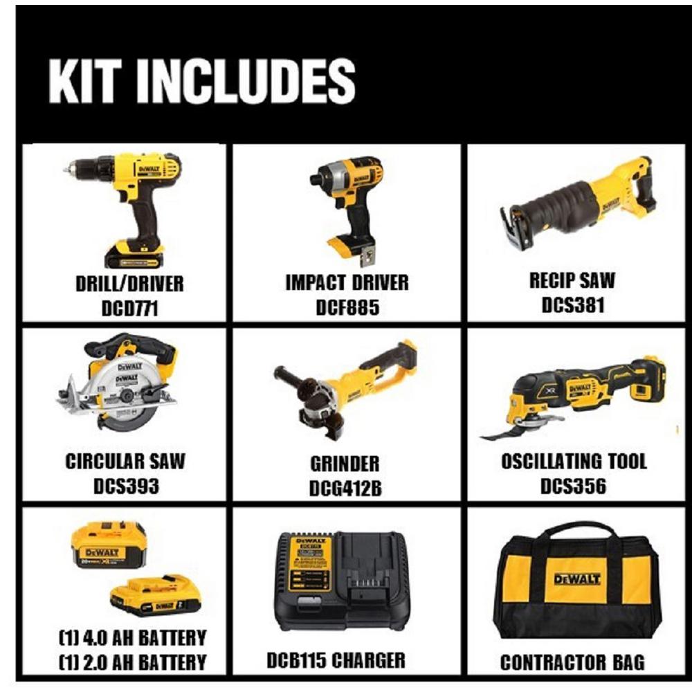 This Cordless 6-Tool Combo Kit includes a 1/2 in. Drill/Driver, Reciprocating Saw, 6-1/2 in. Circular Saw, Brushless Oscillating Multi-Tool, 1/4 in. Impact Driver, 4-1/2 in. Grinder, 20-Volt MAX 2.0Ah battery, 20-Volt MAX 4.0Ah battery, charger, and bag. The DCS393 Circular Saw with 6-1/2 in. carbide blade can cut 2x4s at a 45° angle in a single pass. The DCS381 Reciprocating Saw with keyless blade clamp allows for quick blade changes. The DCD771 Drill/Driver has a high-speed transmission with 2 speeds (0-450 and 1,500 rpm) for a range of fastening and drilling applications. The DCF885 Impact Driver has 3 LEDs with a 20-second delay after the trigger is released for increased visibility. The DCG412 Grinder is equipped with an 8,000 rpm motor for multiple grinding and cutting applications. The DCS356 3-speed selector allows users to choose their speed setting based on application.