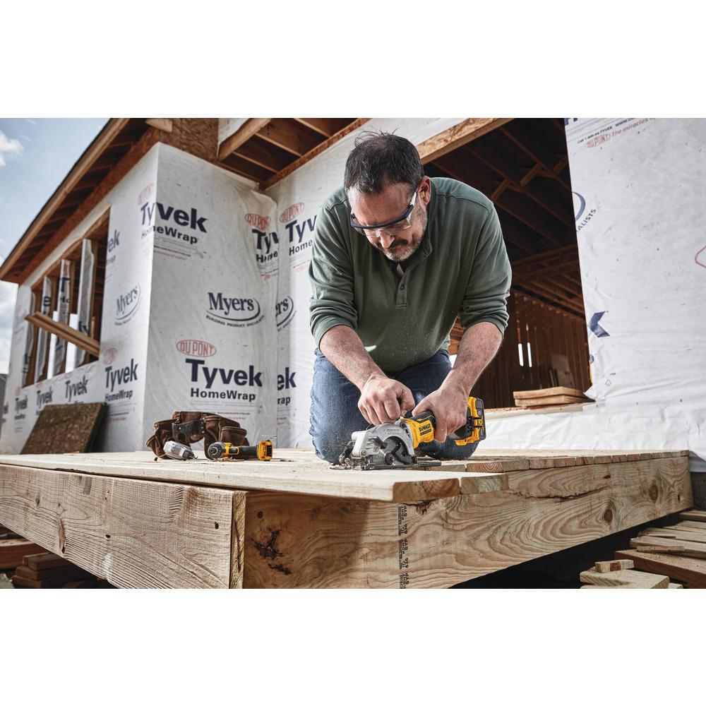 This brushless 4-1/2 in. cordless circular saw kit comes with one 20-Volt MAX 5.0 Ah battery, charger, blade, rip fence, dust port adaptor, and tool bag. The DCS571 cordless circular saw features a bevel gear design allowing users to cut 2x material at 90° and 1x material at 45°. With convenient on-board blade key storage users can change blades with minimal hassle. Elongated handle optimizes reach for rip cutting OSB and plywood. Using the DCB205 battery, you can cut up to 369 lin. ft. of 3/4 in. OSB.