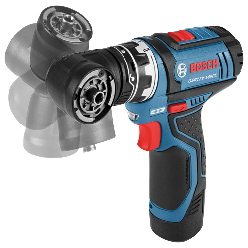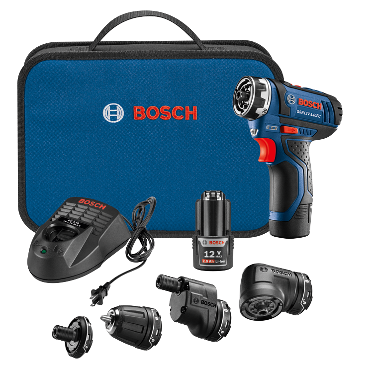 Compact 12V Max drill/driver featuring Bosch’s FlexiClick 5-in-1 attachment system for drilling and driving in tight spaces. Includes keyless chuck, locking bit holder, right-angle and offset attachments, two 2.0Ah Li-ion batteries, charger, and bag.