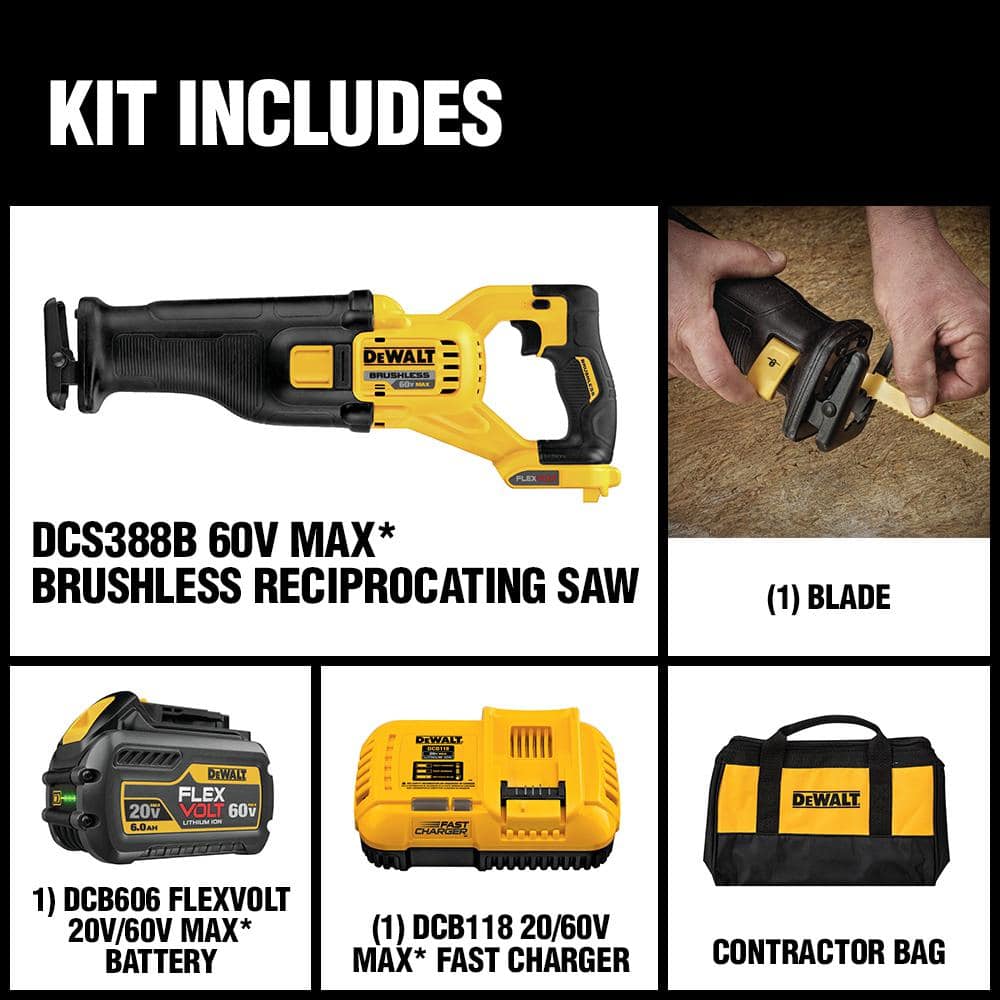 DEWALT FLEXVOLT 60V MAX Lithium-Ion Cordless Brushless Reciprocating Saw Kit with 1 Battery (2Ah at 60V/6Ah at 20V), Charger and Contractor Bag
