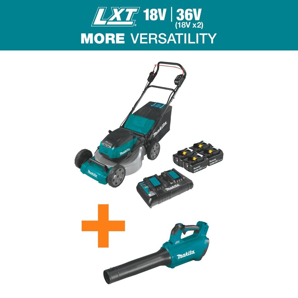 Makita 18V X2(36V) LXT Lithium-Ion Cordless 21 in. Walk Behind Lawn Mower Kit w/4 Batteries 5.0Ah with 18V Blower, Tool Only