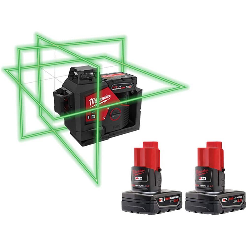 Milwaukee M12 12-Volt Lithium-Ion Cordless Green 250 ft. 3-Plane Laser Level Kit with (3) Batteries, Charger and Case