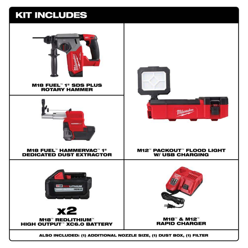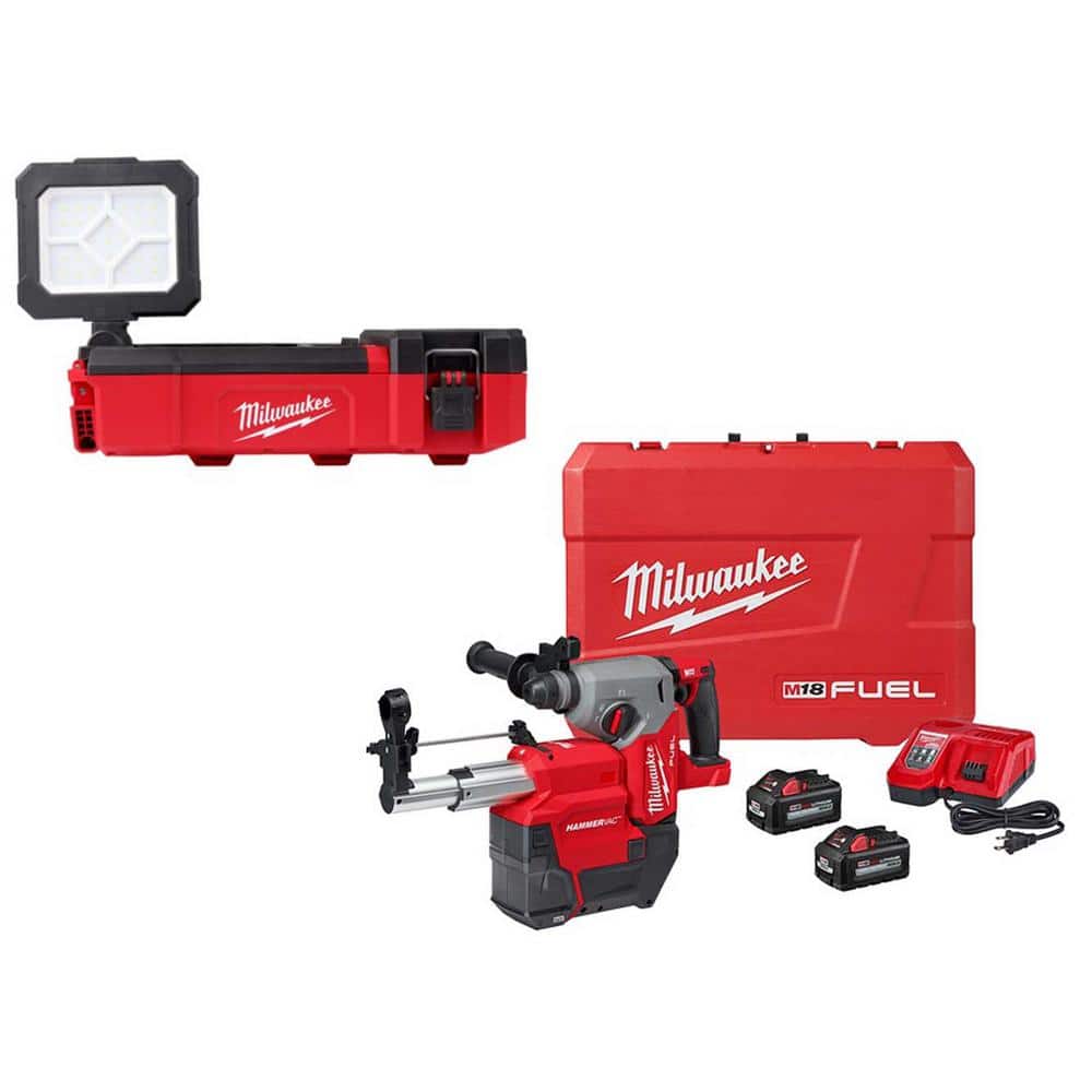 Milwaukee M12 12V Lithium-Ion Cordless PACKOUT Flood Light and M18 FUEL 1 in. SDS-Plus Rotary Hammer/Dust Extractor Kit