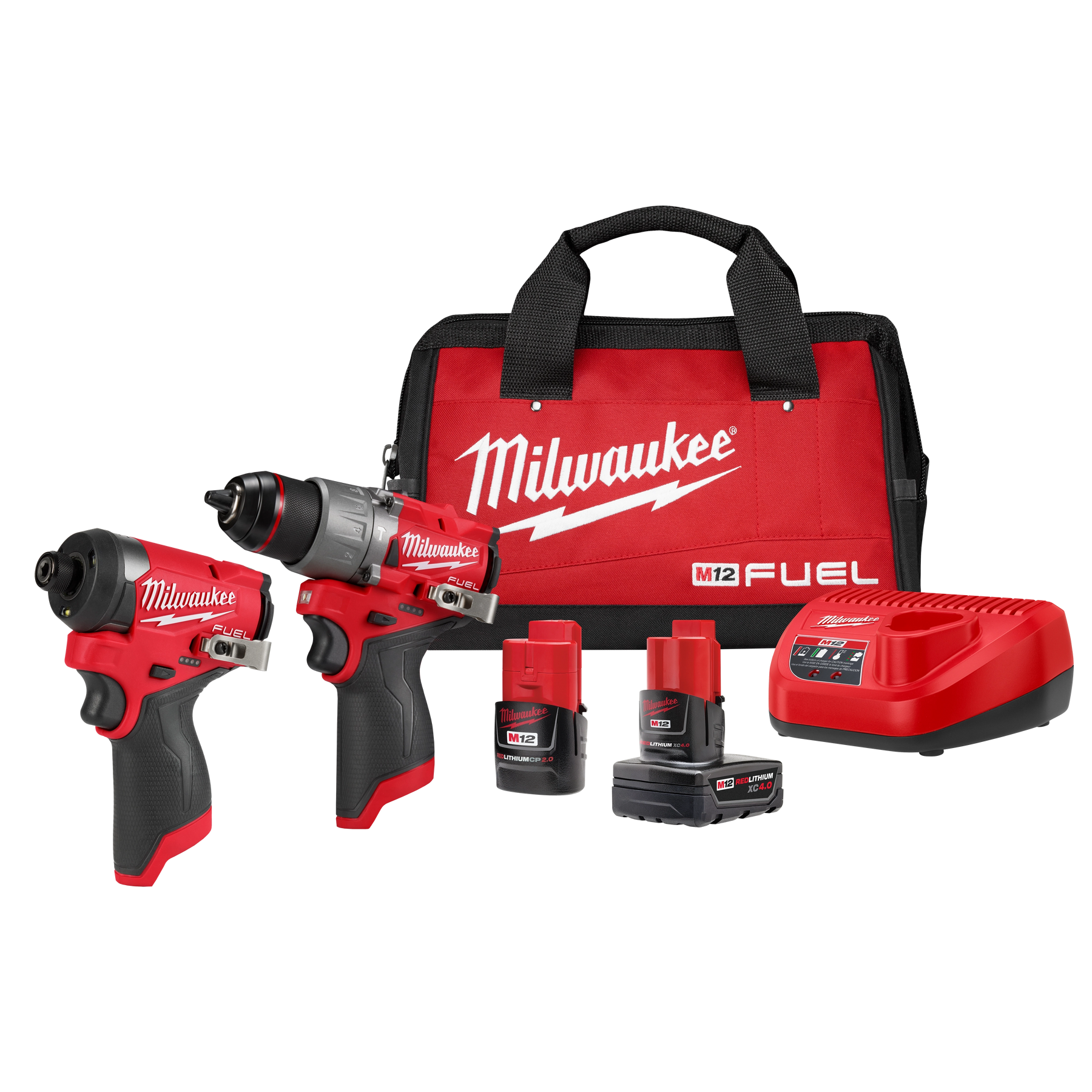 A: M12 FUEL 1/2" Hammer Drill/Driver (3404-20) and M12 FUEL 1/4" Hex Impact Driver (3453-20), plus two batteries, charger, and bag.