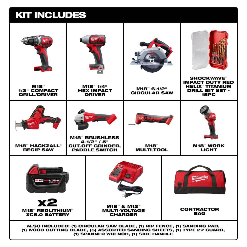 Milwaukee M18 18-Volt Lithium-Ion Cordless Combo Kit 7-Tool with 2-Batteries, Charger and Tool Bag with Drill Bit Set (15-Piece)