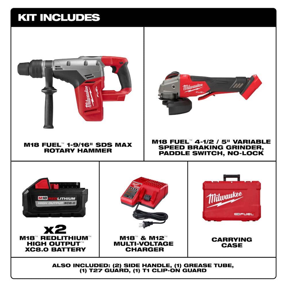 Milwaukee M18 FUEL 18V Lith-Ion Brushless Cordless 1-9/16 in. SDS-Max Rotary Hammer Kit w/Two 8.0Ah Batteries & M18 FUEL Grinder