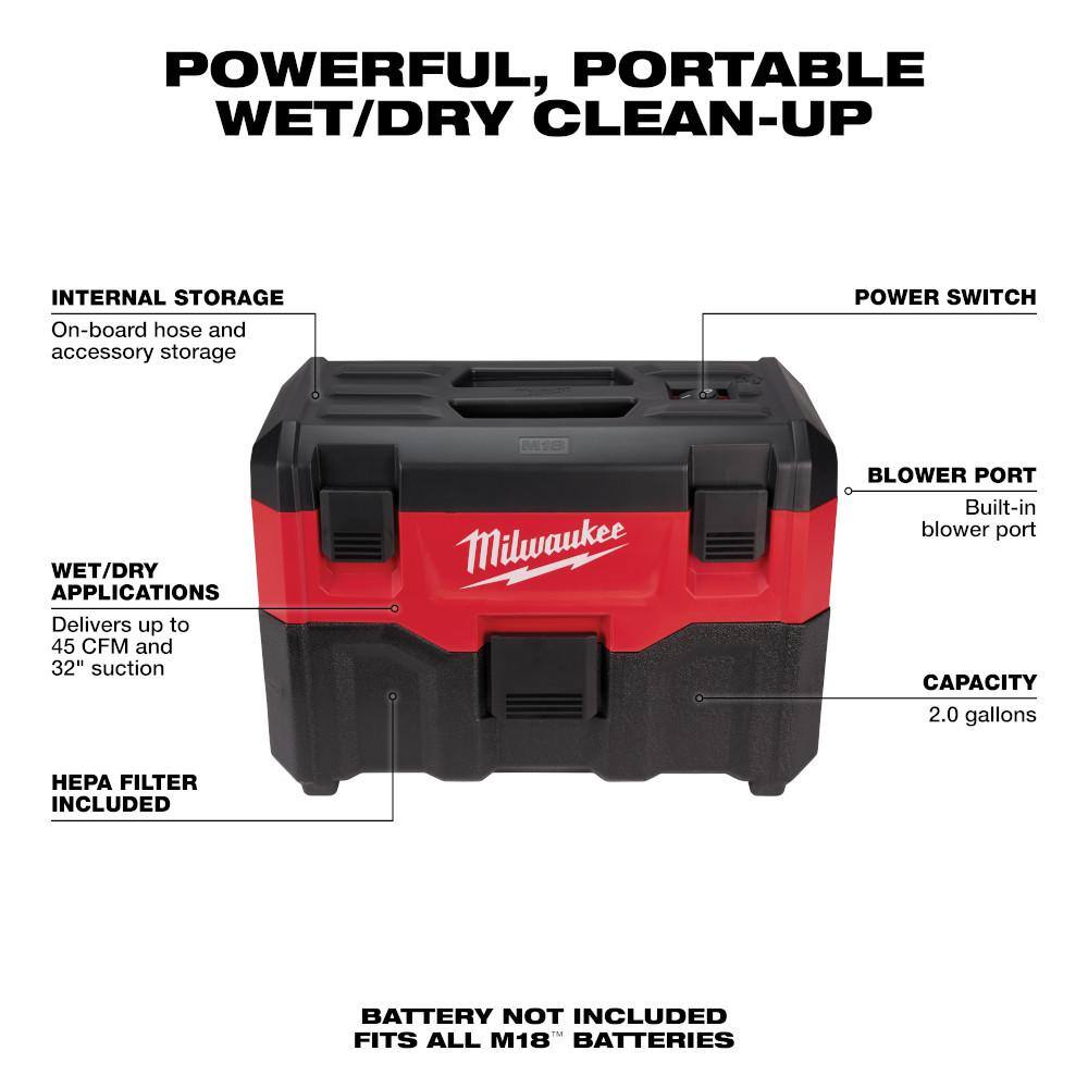 A: The M18 2-gallon wet/dry vacuum offers 45 CFM airflow and includes a built-in blower port for versatile cleaning options.