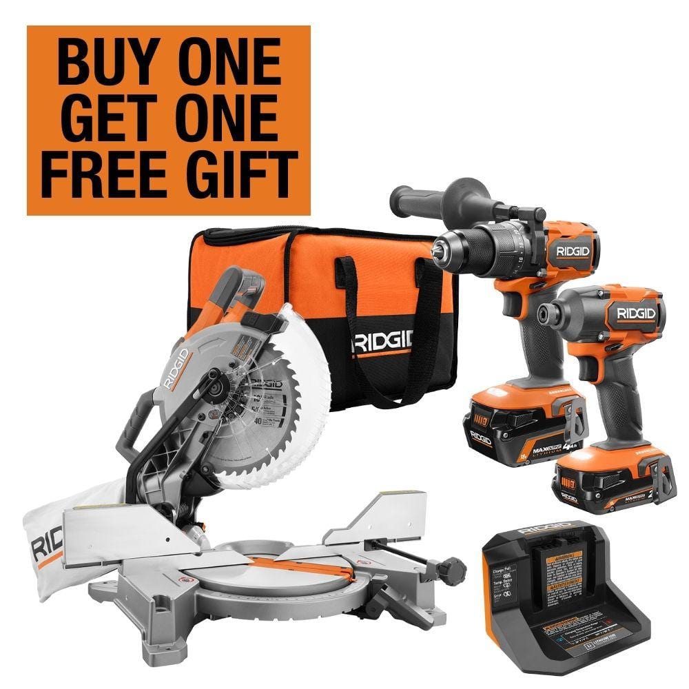 RIDGID 18V Brushless Cordless 2-Tool Combo Kit with (2) Batteries, Charger, Bag, and 15 Amp 10 in. Dual Bevel Miter Saw
