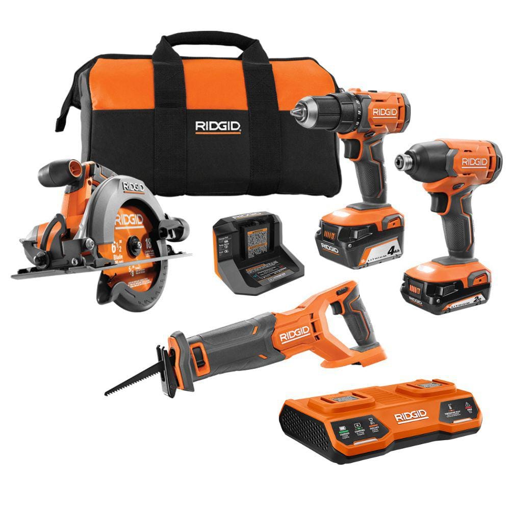 This RIDGID 18V Cordless 4-Tool Combo Kit delivers professional performance with ultimate convenience. Featuring a drill/driver, impact driver, circular saw, and reciprocating saw, this combo set is powered by lithium-ion batteries for extended runtime and lightweight maneuverability. With dual port charger compatibility, it's an indispensable powerhouse for pros and DIY enthusiasts alike.
