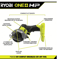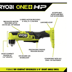 Compact, brushless performance for tight spaces and quick cuts. This RYOBI ONE+ HP 18V kit combines a 3/8 in. right angle drill and a compact cut-off tool, both compatible with all ONE+ 18V batteries for cordless convenience.