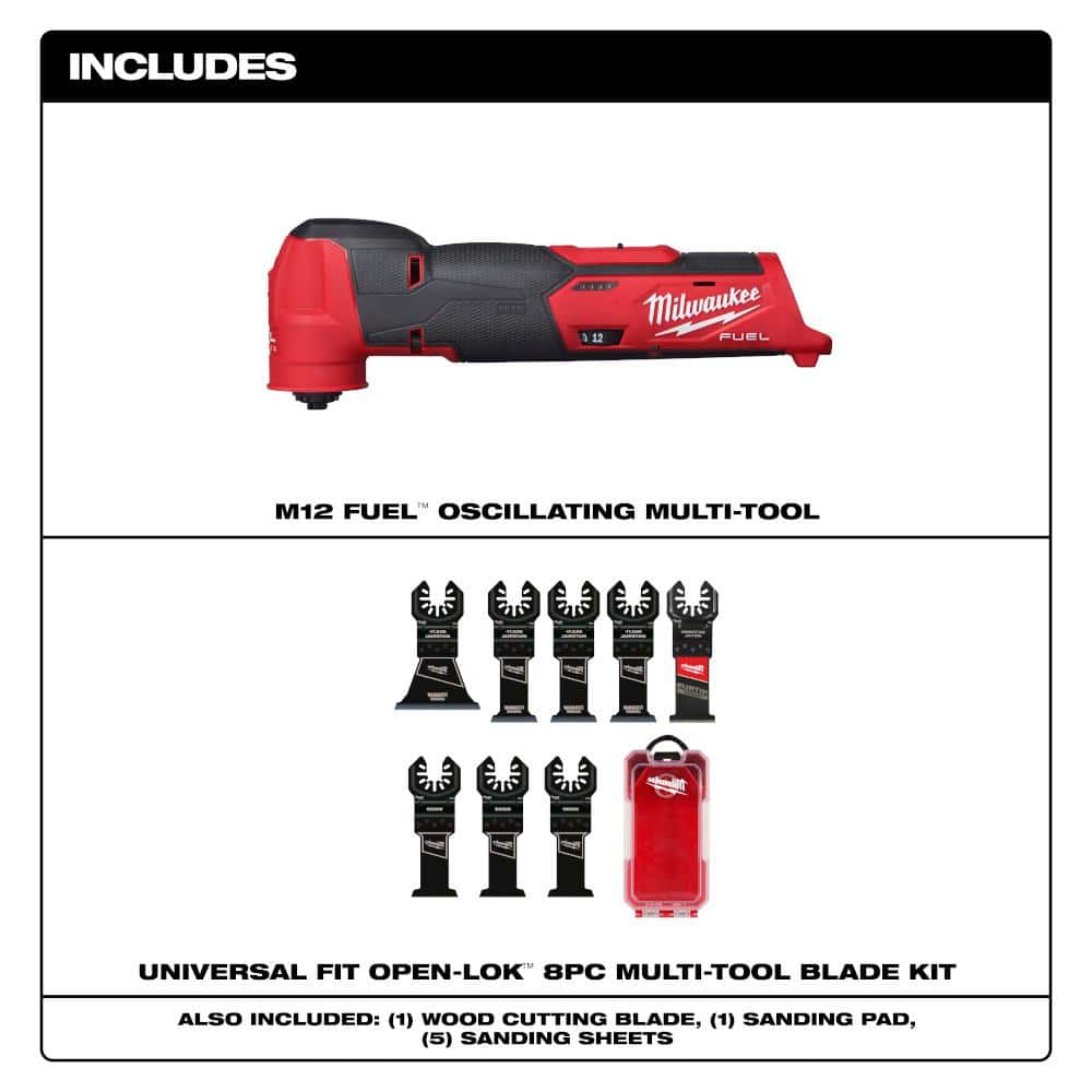 Milwaukee M12 FUEL 12V Lithium-Ion Cordless Oscillating Multi-Tool (Tool-Only) with Oscillating Multi-Tool Blade Set (8-Piece)