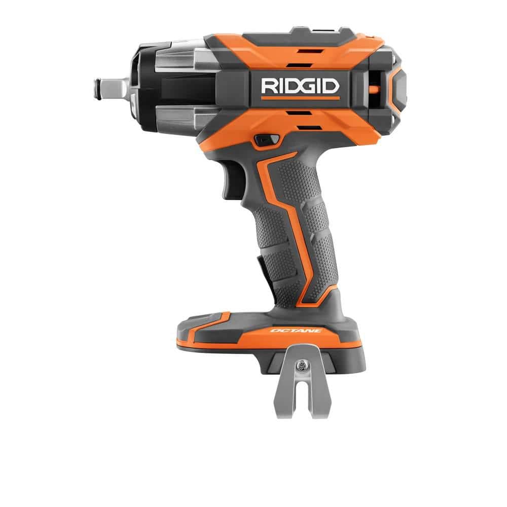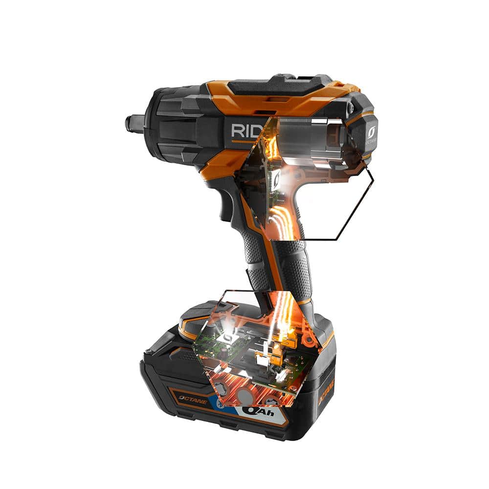High-torque RIDGID 18V OCTANE brushless impact wrench delivers pro-grade fastening power with 4 modes including Auto mode for precision. Features a 1/2 in. friction ring anvil, tri-beam LED lighting, and durable die-cast gearbox; battery and charger sold separately.