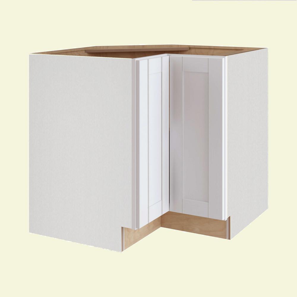 Add a minimalist touch to your home with this easy reach, corner base right hand kitchen cabinet from the Express Vesper White collection by Contractor Express Cabinets. Featuring a white satin vinyl finish and Shaker-style doors and drawer fronts, it will give your kitchen a light, timeless look. The doors and drawer fronts are crafted from MDF with a flat recessed center panel and the cabinets are constructed from CARB II compliant plywood. Its full-depth, 3/4 in. thick adjustable shelves add storage and concealed steel door hinges are adjustable for perfect door alignment. Durable and strong, this cabinet has lasting style.