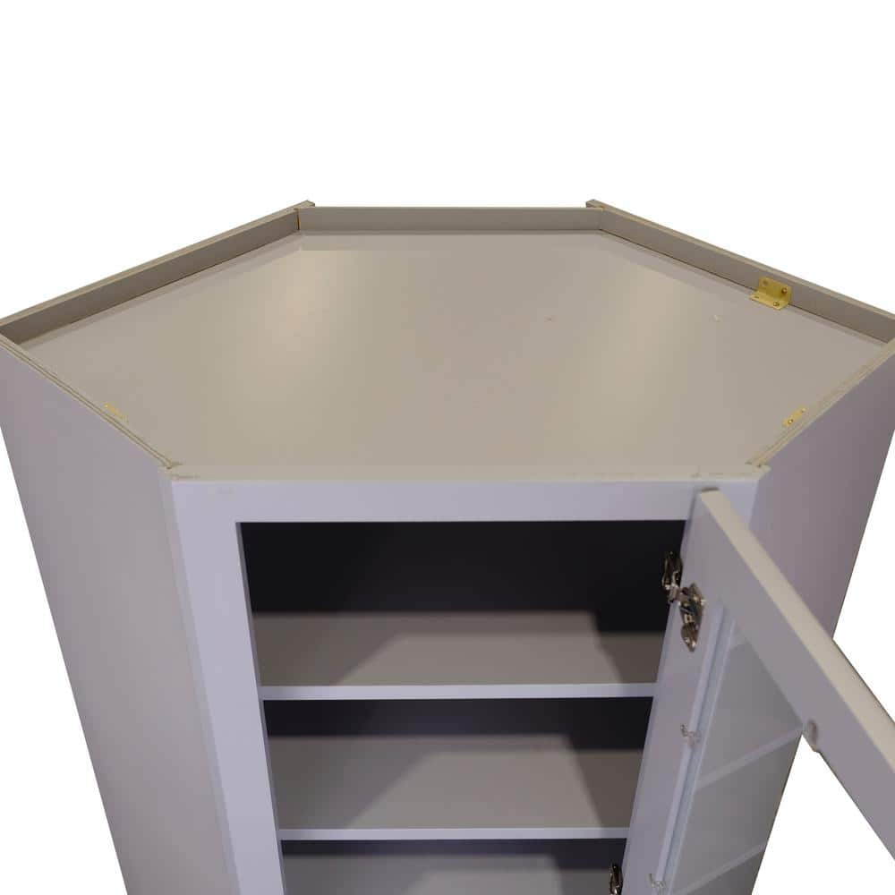 Enhance your kitchen with the Bremen Gray Plywood Diagonal Corner Glass-Door Kitchen Cabinet. Its modern light gray finish and high-quality plywood construction offer both style and durability, while adjustable shelves provide flexible storage for all your kitchen essentials.