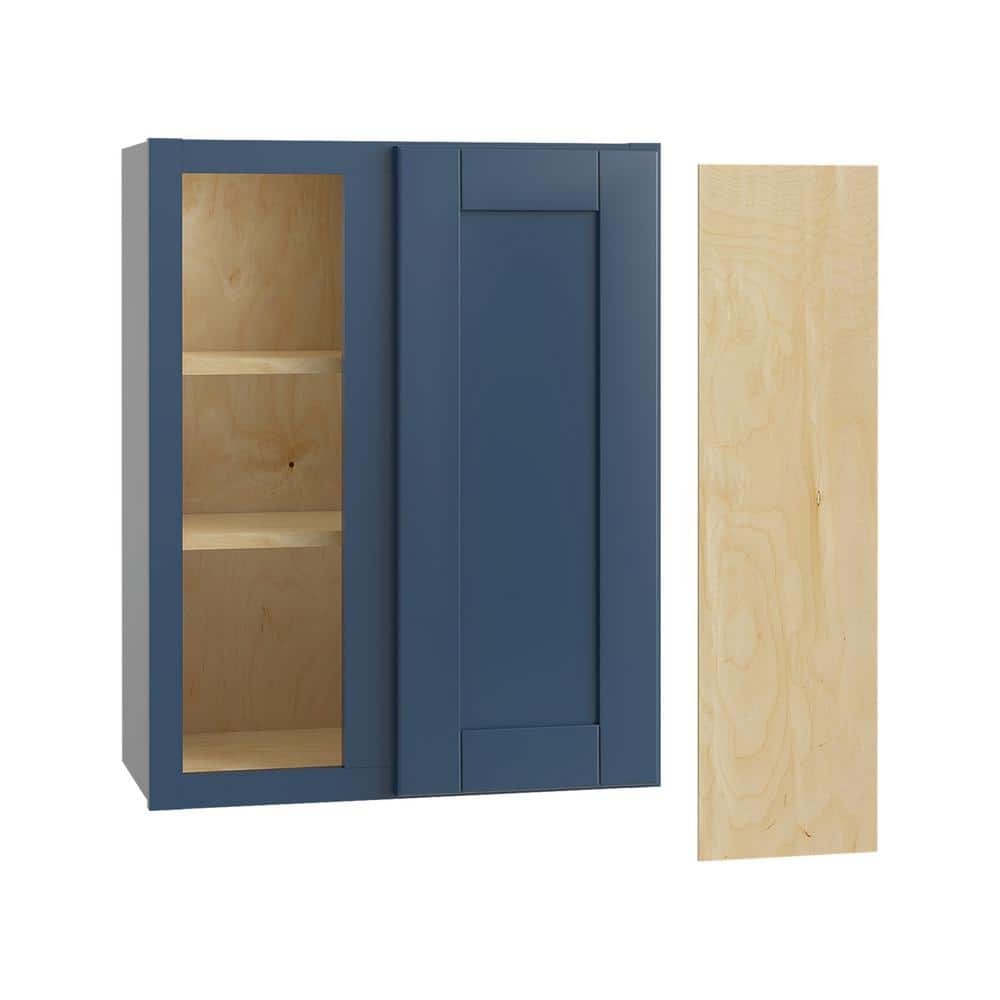 Enhance your kitchen with the Arlington Vessel Blue Shaker Wall Corner Cabinet by Contractor Express Cabinets. Featuring a striking blue thermofoil finish with a contrasting white back panel, this elegant design combines aesthetic appeal with functionality. Its soft-close doors and adjustable shelves ensure smooth operation and versatile storage, while CARB II compliant plywood construction ensures durability and eco-friendliness.