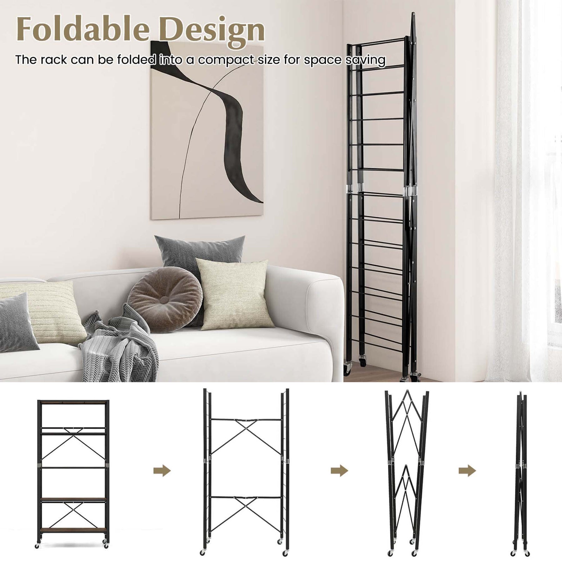 Elevate your kitchen organization with the Costway Rolling Kitchen Cart, featuring a sleek black metal base and a durable MDF wood top. Its foldable design and versatile shelf adjustment cater to all your storage needs while ensuring easy mobility with lockable wheels.