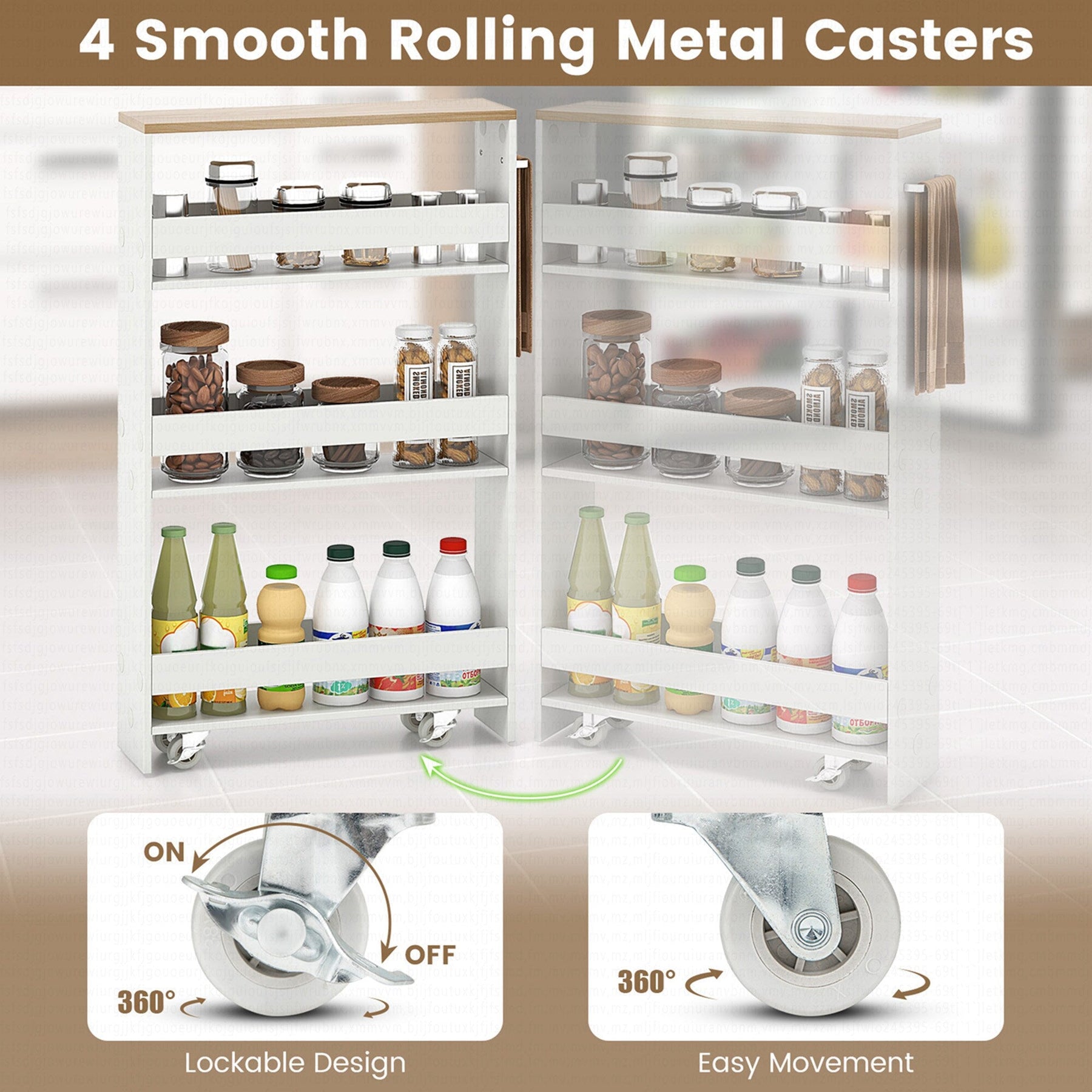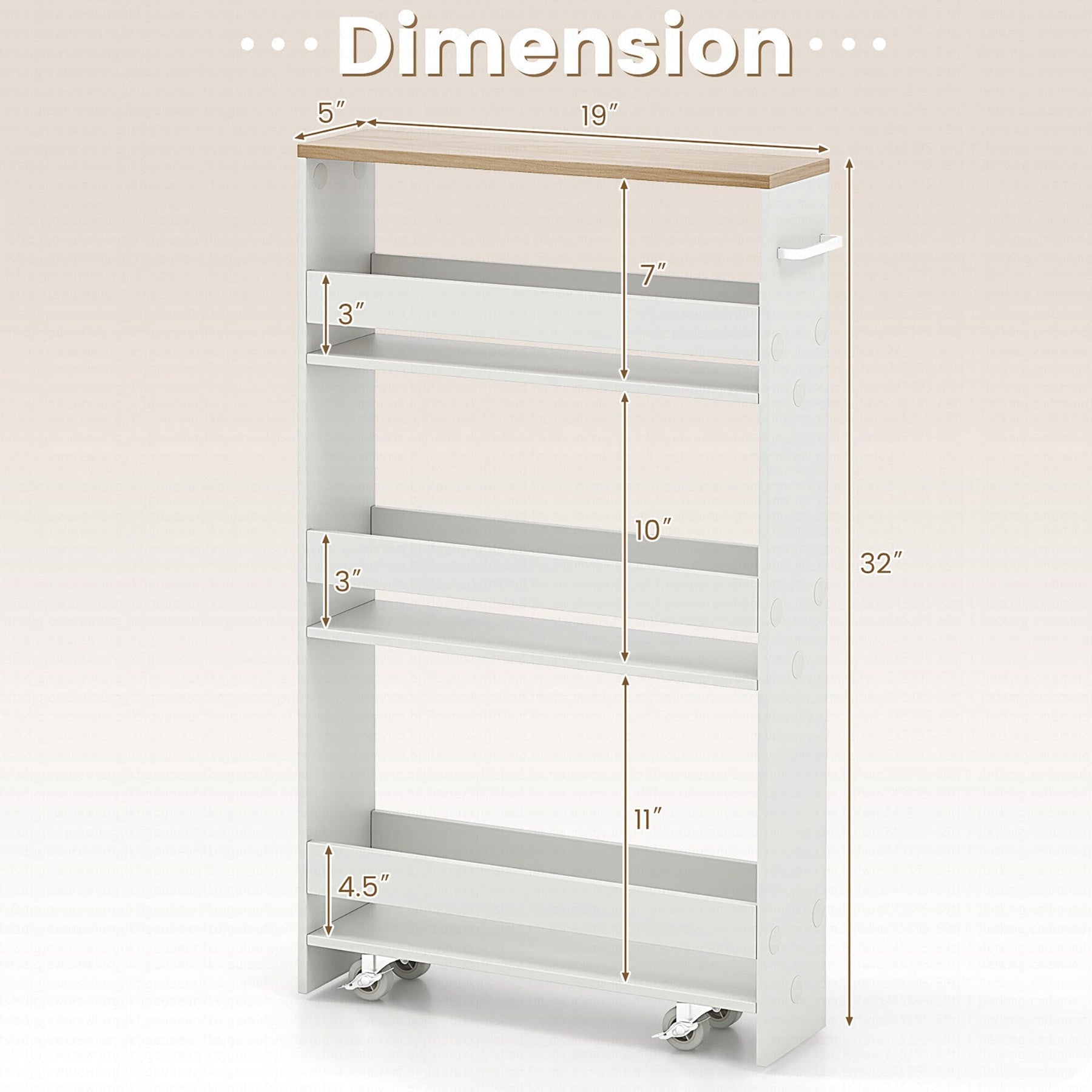 Effortlessly optimize your kitchen space with the Costway Slim Rolling Kitchen Cart. With its white metal base and wood metal top, this flexible cart is perfect for narrow gaps, offering ample 4-tier storage for spices, condiments, and other kitchen essentials. Designed for both style and durability, it features smooth-rolling, lockable wheels and a sleek, contemporary look that complements any space.