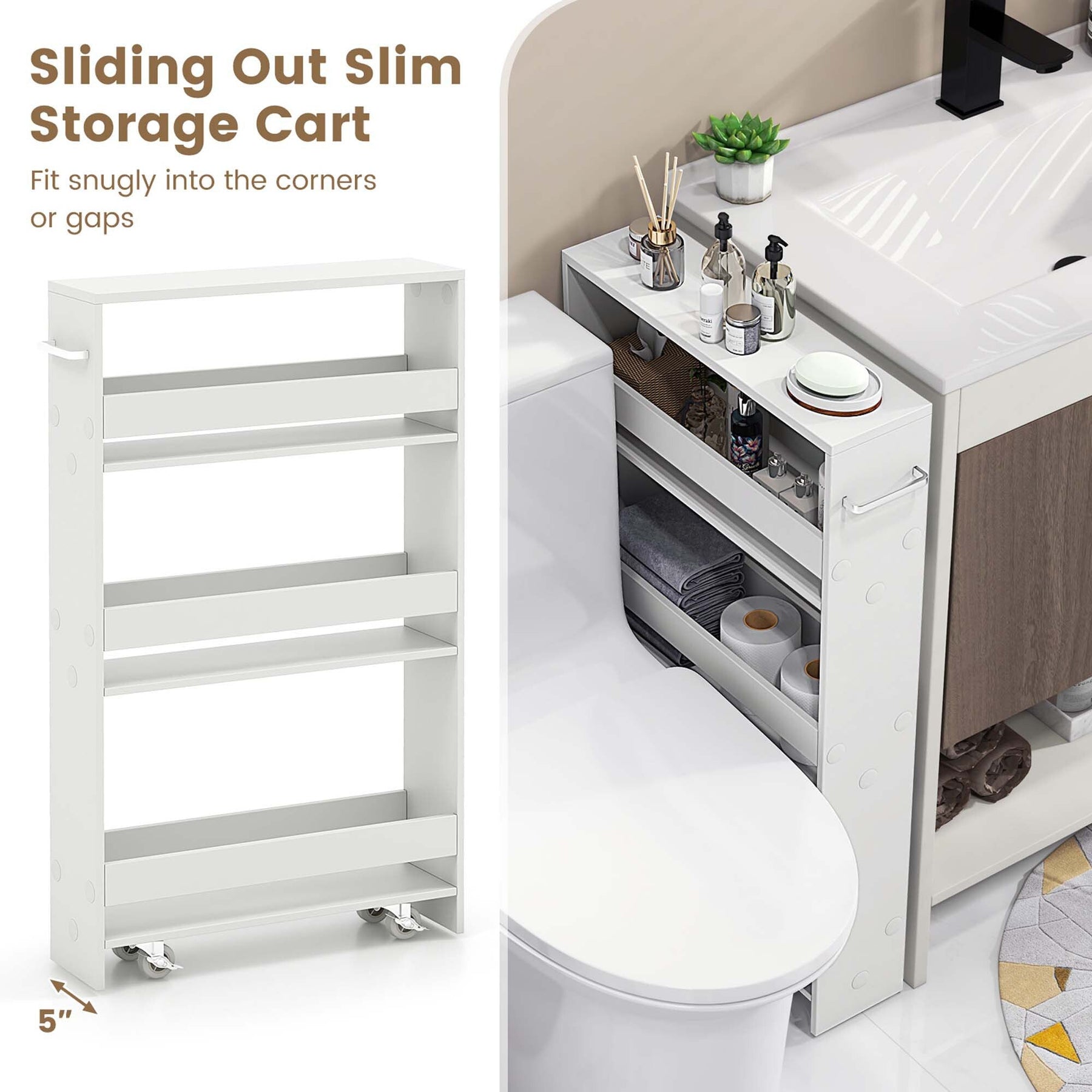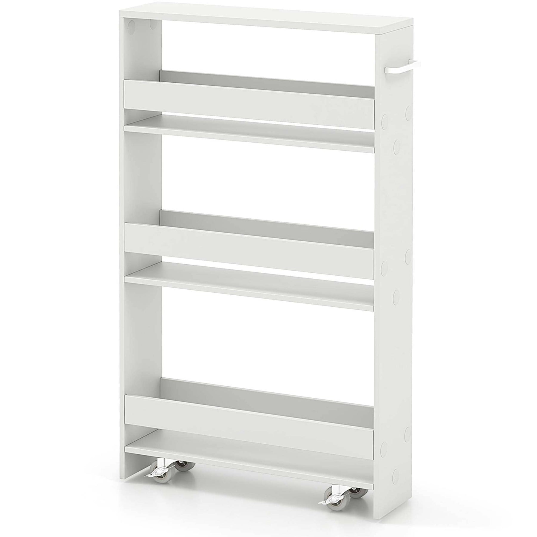 Streamline your kitchen organization with the Costway Rolling Kitchen Cart. Designed with a sturdy white wood base and sleek wood top, this mobile storage solution enhances both functionality and style. Ideal for tight spaces, it effortlessly glides into narrow gaps to keep your kitchen essentials neatly arranged.