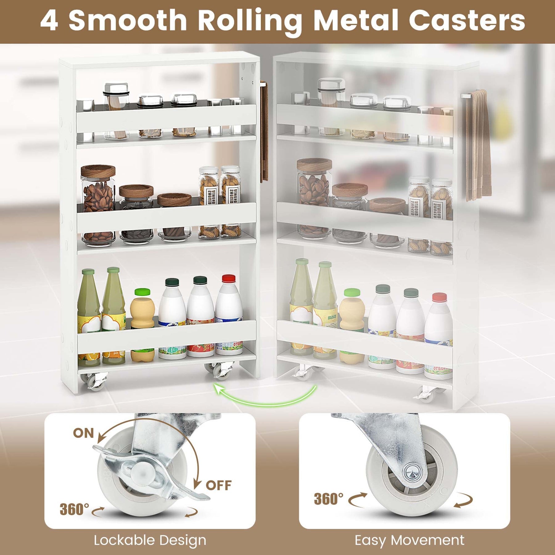 • Ample Storage: 4-tier shelving to neatly organize condiments, spice jars, and kitchen tools, complete with protective bars.