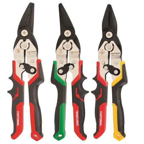 CUT CAPACITY: Cuts up to 18ga (1.2mm) cold-rolled steel or 22ga (0.7mm) stainless steel EASE OF USE: Spring-assisted latch for fast one-handed operation DURABILITY: Induction hardened cutting edge stays sharp longer (compared to non-induction hardened jaws) 1/4-in blade markings for quick precise cuts Common applications include metal cutting Includes (1) Right Cut Aviation Tin Snips (CMHT73557), (1) Left Cut Aviation Tin Snips (CMHT73755) and (1) Straight Cut Aviation Tin Snips (CMHT73756) CRAFTSMAN Full Lifetime Warranty