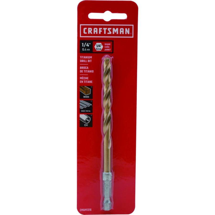 COMPATABILITY: 1/4-in Hex Shank Bits are compatible with Impact Drivers, CRAFTSMAN® 3-in Locking Magnetic Bit Holder and 1/2-in Drill/Drivers CORROSION RESISTANT: Titanium Coated drill bits promotes longer life PRECISE HOLE PLACEMENT: Split Point provides precise hole placement and clean, burr-free holes Common applications include wood; metal; plastic Includes (1) 1/4-in Drill bit